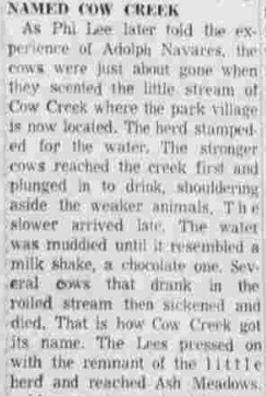 The mining boom of the 1800s attracted many to the West[1] as we all know. The Lee Brothers who grew up, in Sierra Valley California,[2] amidst the Great Gold Rush were no exception to such ways. The Lees parents had moved from New England, Massachusetts,[3] to California around the 1850s.[4] But the Lee Brothers had come of age as the Unexplored[5] West was deminishing, opening up new land full of discoveries, discoveries of much more than just Gold.[6][7] Taking lessons from their Father,[8] the boys set out on their own with a sensible, fair heard of cattle. First they set up a ranch in Virginia City,[9X] until the Mines there began drying up. Thus they herded their Cattle to Death Valley. But their fortune was fleeting, their rout as so many, was laden with hazards. By time they arrived, their Cattle had all but perished.[10] Setting up camp in Death Valley Phi took an Indian wife, Tvan, Cub already had an Indian wife, Minnie, the brothers regrouped and moved down to the lush fields and abundant water at Ash Meadows. They arrived in 1874 with their now large heard of sheep, paid their taxes and built their first homes. They would later replace those sheep again with Cattle, some likely from Charles King as he abandoned Ash Meadows, and others even later on Cattle Drives with the Younts. But the Lee Brothers reached fame, not from their ranch, but from their many lucrative mining strikes. Little did they know of the wealth in clay right beneath their feet, but such major prospects as the Lida C, made them the legend that they are. Phi moved on to Resting Spring and Cub to Shoshone. Only Bob, Phi's Son, is known to have stayed behind to live out his life at Ash Meadows. But the boys too made their mark in history discovering Gold, again up in the Funeral Mountains at what would become the townsite of Lee Camp.