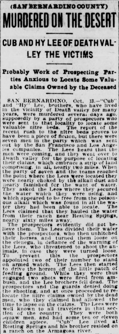 Leander / Meander Lee (Cub), was born in 1843 in Ohio[C1] the third son of Joseph and Margret Lee.[C1] Cub married Minnie C in 1860s.[C2] They had three children.[C3] Rose Elizabeth born 1865 in Spring Valley California.[C4] Ella (Peanuts) born 1868 in Spring Valley California.[C5]. One Sock born between 1870 and 1894.[C3]. It is a common story that Minni and One Sock were murdered** when they lived at Metbury Spring (modern day Shoshone), many News Papers even proclaiming that Cub had shot them.[C6] However Cub moved in with Phi,[C7] and was only aledgedly detained for a cooling off period.[C8] He then went on to live a life of solitude at Cub Lee Springs (modern day Sandy Valley).[C9] Cub himself gained quite a reputation as a storyteller, often quoted in books about him and his brothers. His daughter Rose went on to get married[C10] at 18 and moved away?* Cub himself was left for dead with his brother Hy, when a group of men shot them for their Water Wagon in Death Valley, 1902.[12] However Cub survived and ended up in a Veterans Hospital[13] where he lived for the rest of his life, passng on 3 DEC 1911.[14] Minnie C sold off their claims after Cub was shot.[15]